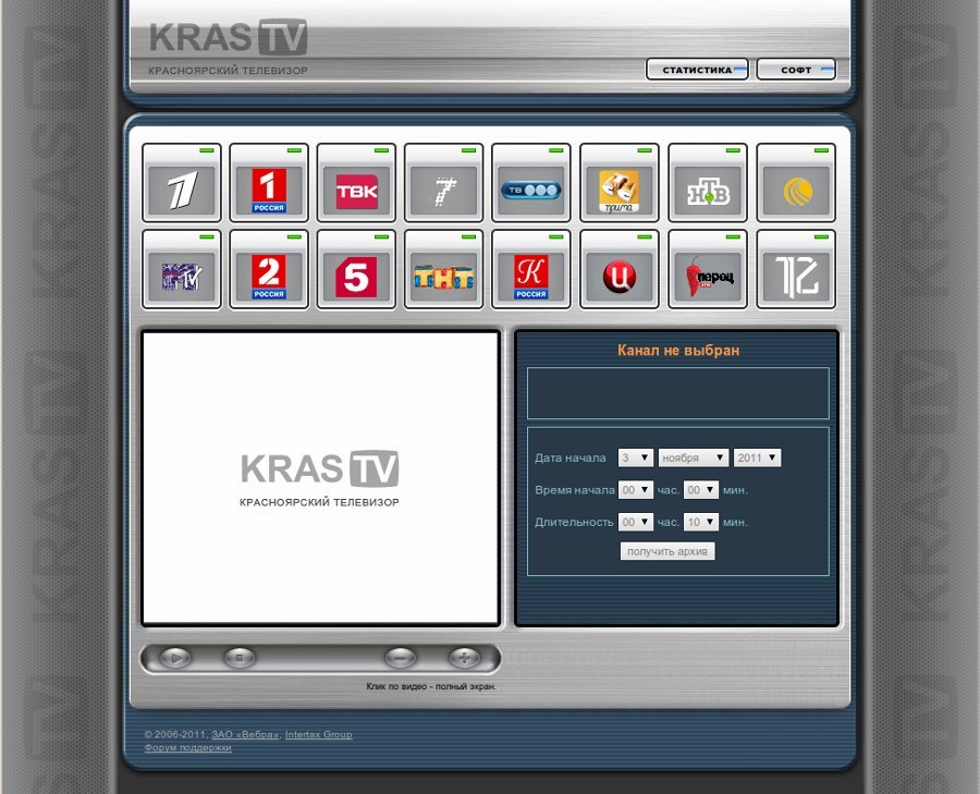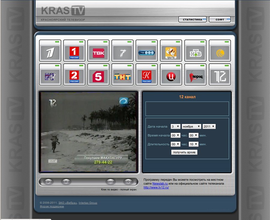 Красноярский телевизор – это 16 эфирных телеканалов для онлайн-просмотра, а также их архивы, которые хранятся 7 дней с момента записи. Для просмотра не нужно устанавливать дополнительные программы - достаточно открыть окно браузера. Передача данных через пиринговую сеть RED-IX (KRS-IX) обеспечивает высокую скорость и стабильность работы. Качество изображения при этом соответствует обычной телевизионной «картинке». На портале ведется детализированная статистика просмотров, которая может быть основой для составления рейтинга ТВ-каналов среди интернет-пользователей с точностью до одного зрителя.