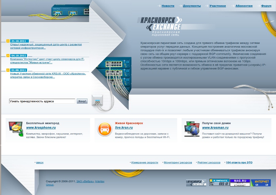 Сайт www.red-ix.ru посвящен услуге доступа к межрегиональной пиринговой сети RED-IX (KRS-IX). В узел обмена интернет-трафиком включено порядка 60 операторов связи по всему Сибирскому федеральному округу. В красноярском дата-центре RED-IX размещено оборудование популярных международных и российских контент-провайдеров, которое обеспечивает наилучшую связь для абонентов Участников RED-IX. На сайте ведется каталог популярных сибирских ресурсов с подробной статистикой и размещена документация по работе с сетью.